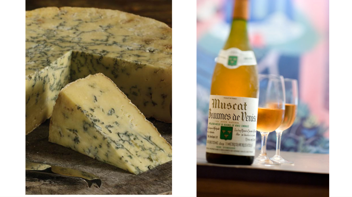 Un beau Stilton (Fromage anglais à pâte persillée) et l’envoutant Muscat de Beaumes-de-Venise